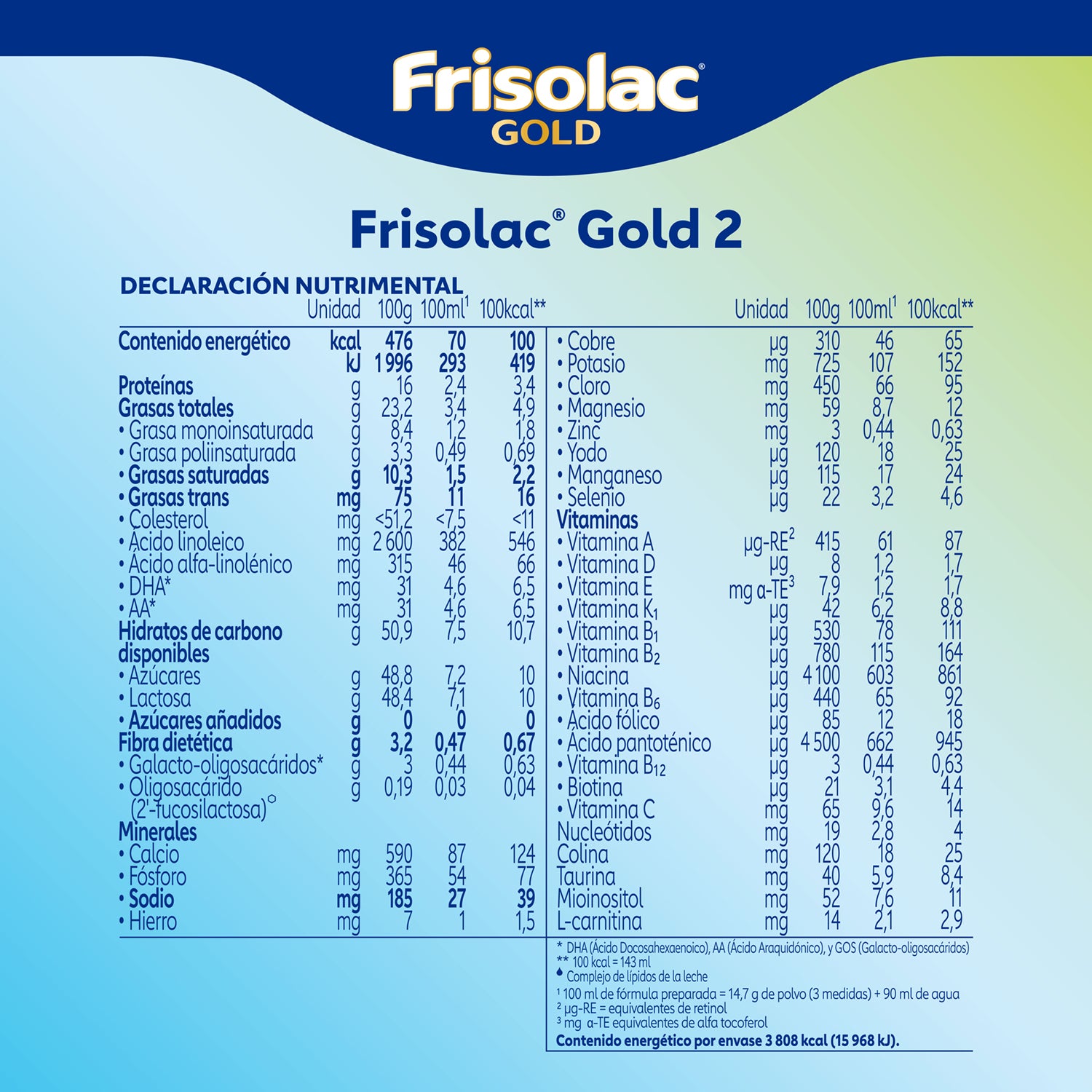 - Frisolac Gold 2 fórmula con HMO 2´-FL (Oligosacáridos de la leche materna. No obtenidos a partir de leche humana. 2´-FL: 2´-Fucosil-Lactosa).